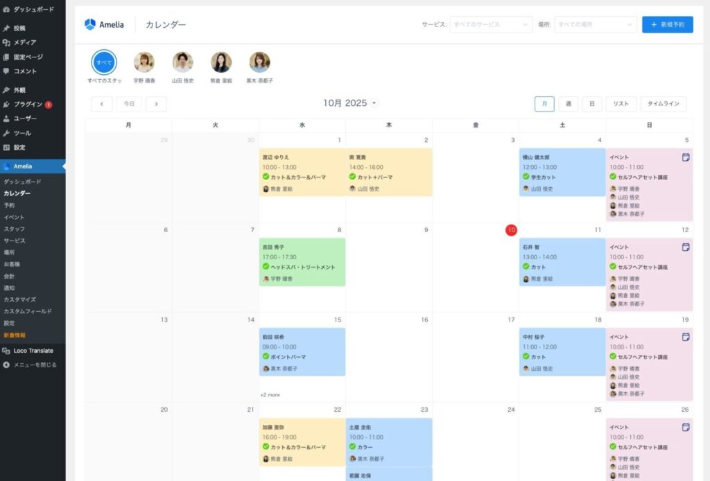 Ameliaの「カレンダー」ページは、スタッフ、サービス、場所別に整理されたすべての予定とイベントを含む予約カレンダーを提供します。管理者は、このカレンダービューを通じて、全体像を瞬時に把握できます。