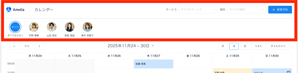 • フィルター機能:サービス、場所、スタッフのフィルターを活用して、関連データを素早く見つけることができます。