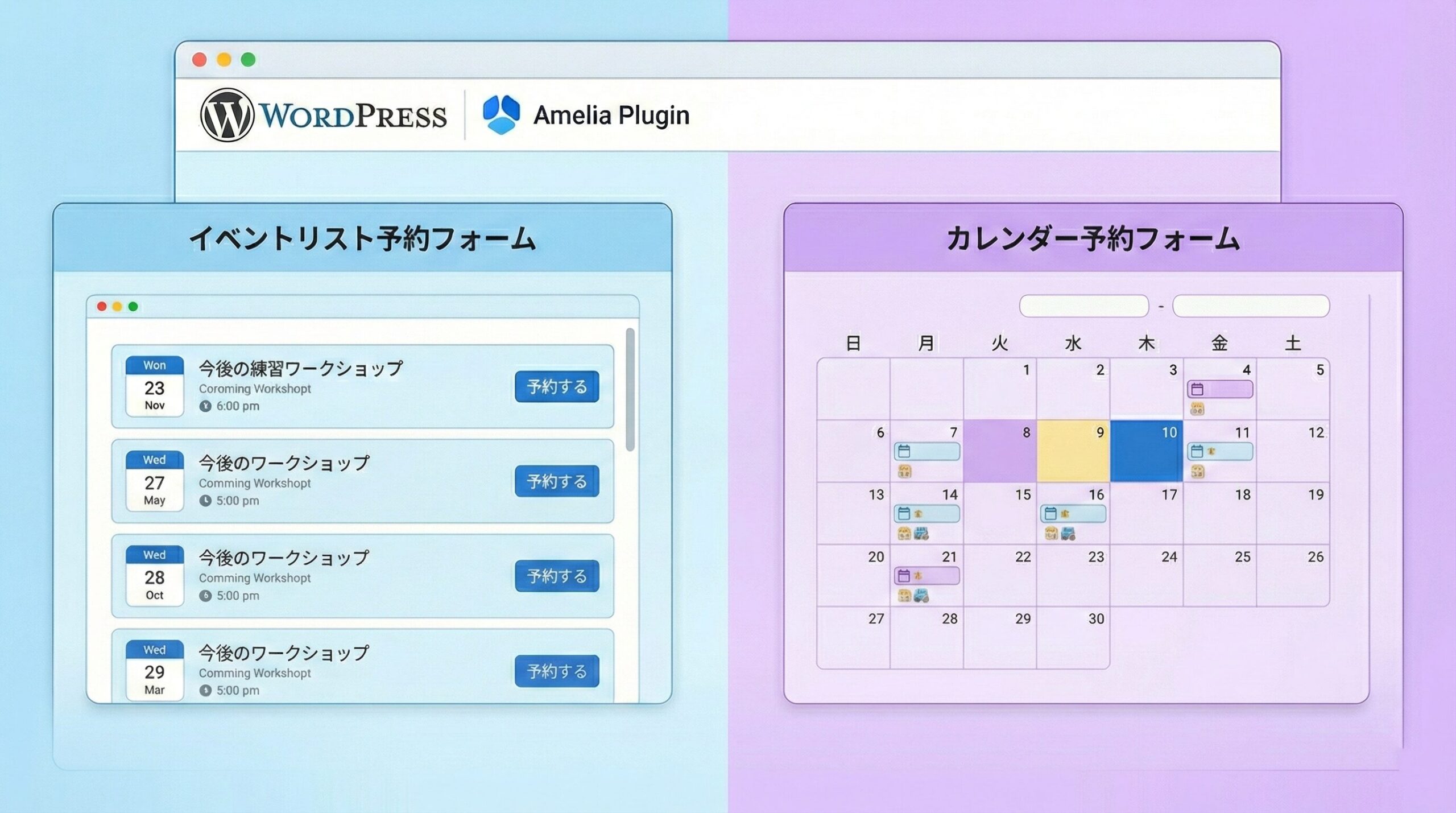 WordPressプラグイン「Amelia」は、この課題を解決するために設計された、高度で柔軟な予約システムです。特にイベントフォーム機能においては、「イベントカレンダー予約フォーム」と「イベントリスト予約フォーム」という二つの強力なツールを提供し、参加者に対して極めてスムーズでプロフェッショナルな予約体験を提供します。