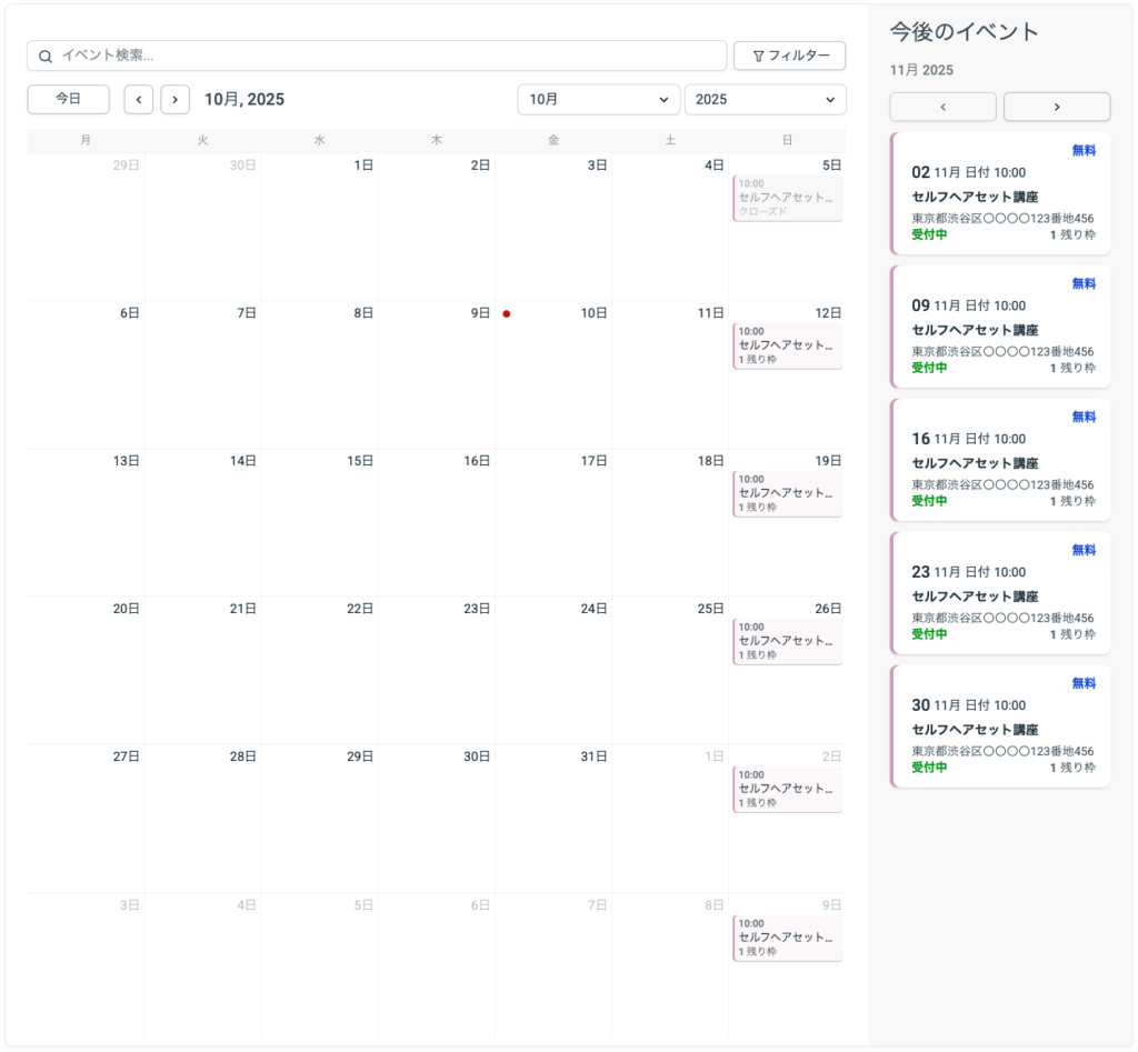 ビジネスイベントをカレンダー形式で表示することは、特に定期的なトレーニングやセミナーを提供している場合に有効です。この直感的に使えるレイアウトは、単に予約体験を向上させるだけでなく、イベントへの参加率向上にも役立つことが期待されます。