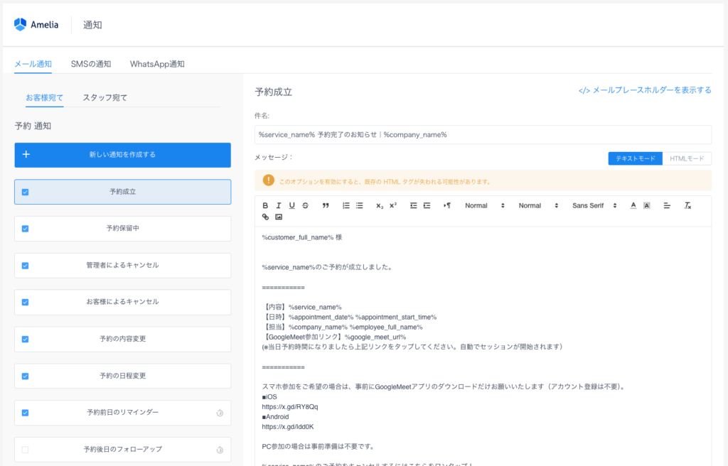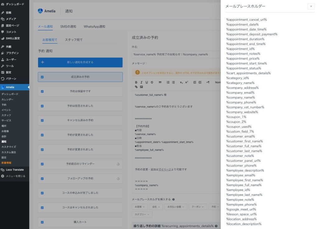 プレースホルダーの活用:通知には、予約されたサービス名 (%service_name%)、お客様の氏名 (%customer_full_name%)、日時 (%appointment_date% %appointment_start_time%)、担当スタッフ名 (%employee_full_name%)、会社名 (%company_name%) といった、実際の予約データに置き換えられるプレースホルダーを利用できます。