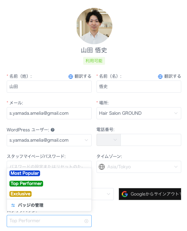 スタッフバッジ:特定のスタッフをハイライト表示するために「スタッフバッジ」を使用できます。「Exclusive(限定バッジ)」などのバッジを付けて、特別なサービスを提供していることを示すことができます。