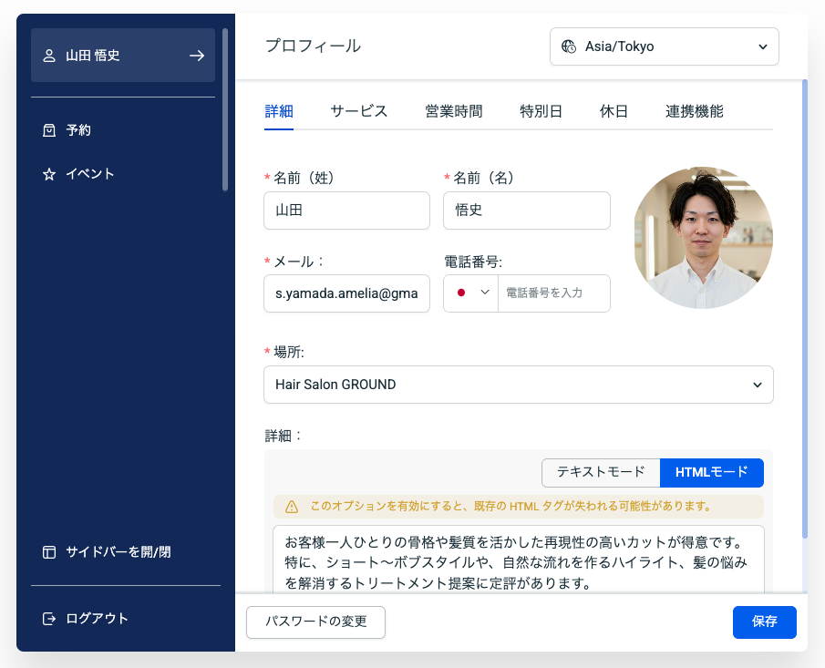 サイト内での管理:スタッフはWordPressダッシュボードにアクセスすることなく、サイトページから直接、予定、イベント、プロフィールをスムーズに管理できます。