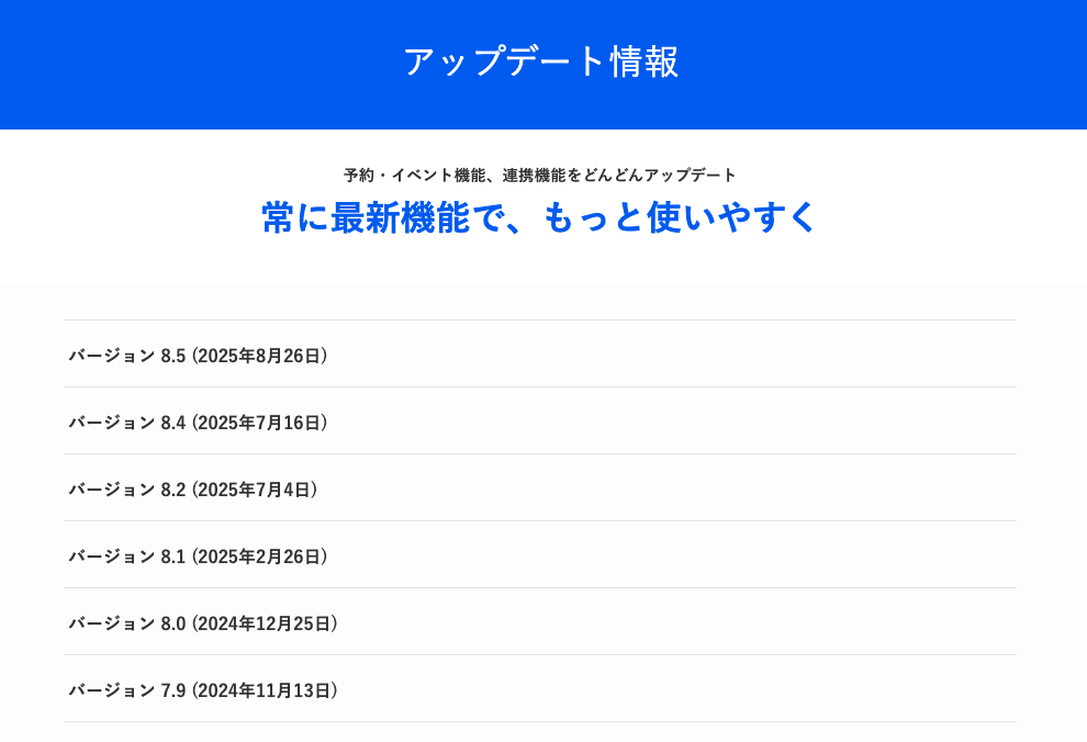 予約システムは顧客情報を扱う重要なツールだからこそ、常に最新かつ安全な状態を保つことが不可欠です。 Amelia(アメリア)では、利用者がアクセスできる「アップデート情報ページ」をご用意しており、システムの進化をリアルタイムで共有しています。