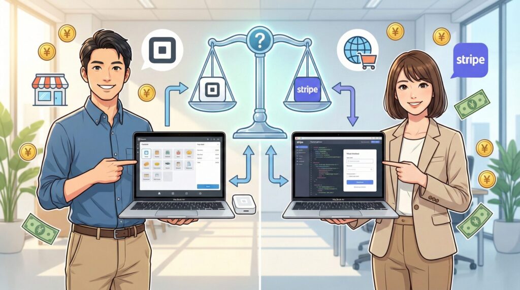 結論から言うと、対面決済メインならSquareがやや有利、オンライン決済(特にJCB)ならStripeが有利なケースが多いですが、ビジネスモデルによって異なります。