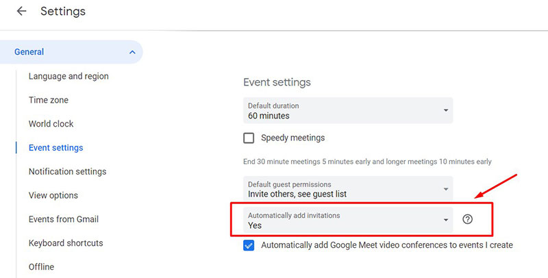 左側の列の**「一般」セクションをクリックし、「イベント設定」**までスクロールします。