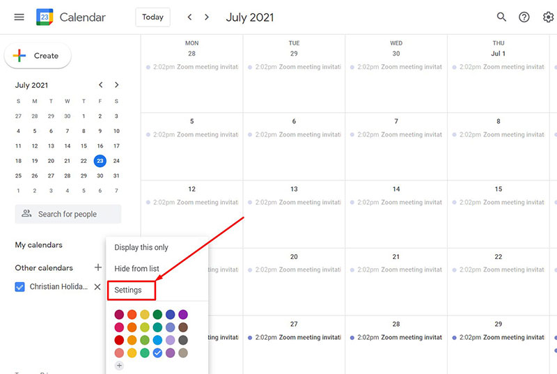 そのカレンダーにマウスオーバーし、縦に並んだ**3つの点(オプション)**をクリックします。複数のカレンダーを追加する場合は、カレンダーごとにこの手順を繰り返します。
