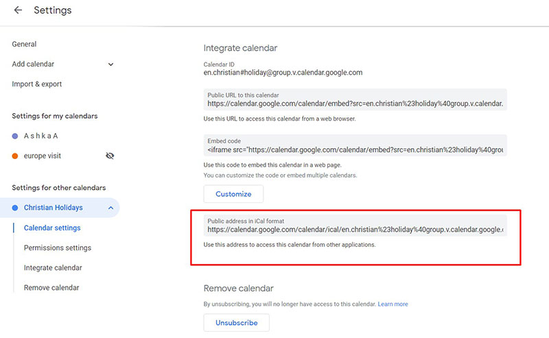 **「設定と共有」をクリックします。左側の列の「カレンダーを統合」**セクションに移動します。