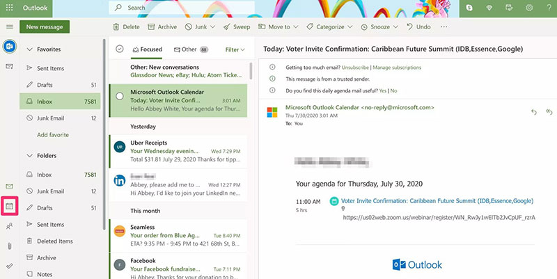 Outlook.comにアクセスしてログインします。ログイン後、左側のサイドバーにあるカレンダーアイコンをクリックします。