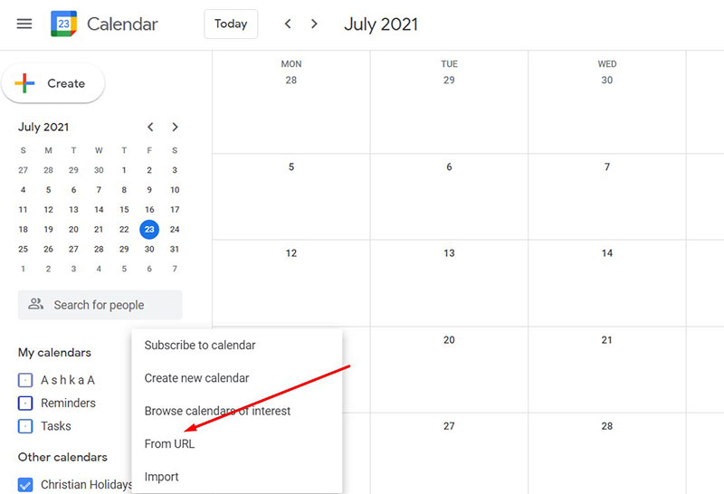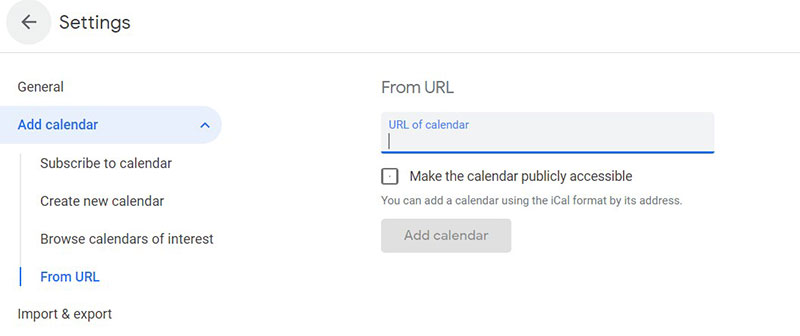 左側の列にある**「カレンダーを追加」オプションをクリックし、「Web から購読」**を選択します。