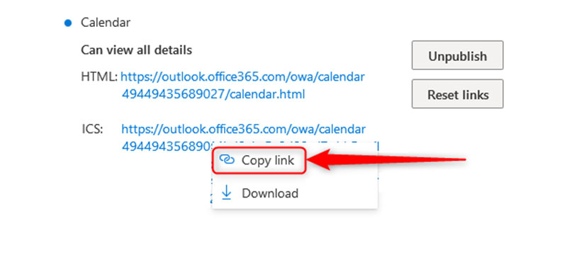 設定を保存すると、HTMLリンクとICSリンクの2つのリンクが表示されます。ICSリンクをコピーしてください。