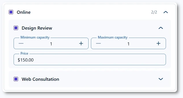 展開されたサービス行内で、選択したスタッフに対して、カスタムの最小および最大定員を設定できます。 これらの値は、サービス設定で設定されているデフォルトの定員を上書きし、この特定のスタッフにのみ適用されます。 例えば、サービスのデフォルト定員が1に設定されている場合でも、特定のスタッフが同時に2人のお客様に対応できる場合は、ここで最大定員を増やすことで、お客様画面の空き状況が自動的に調整されます。