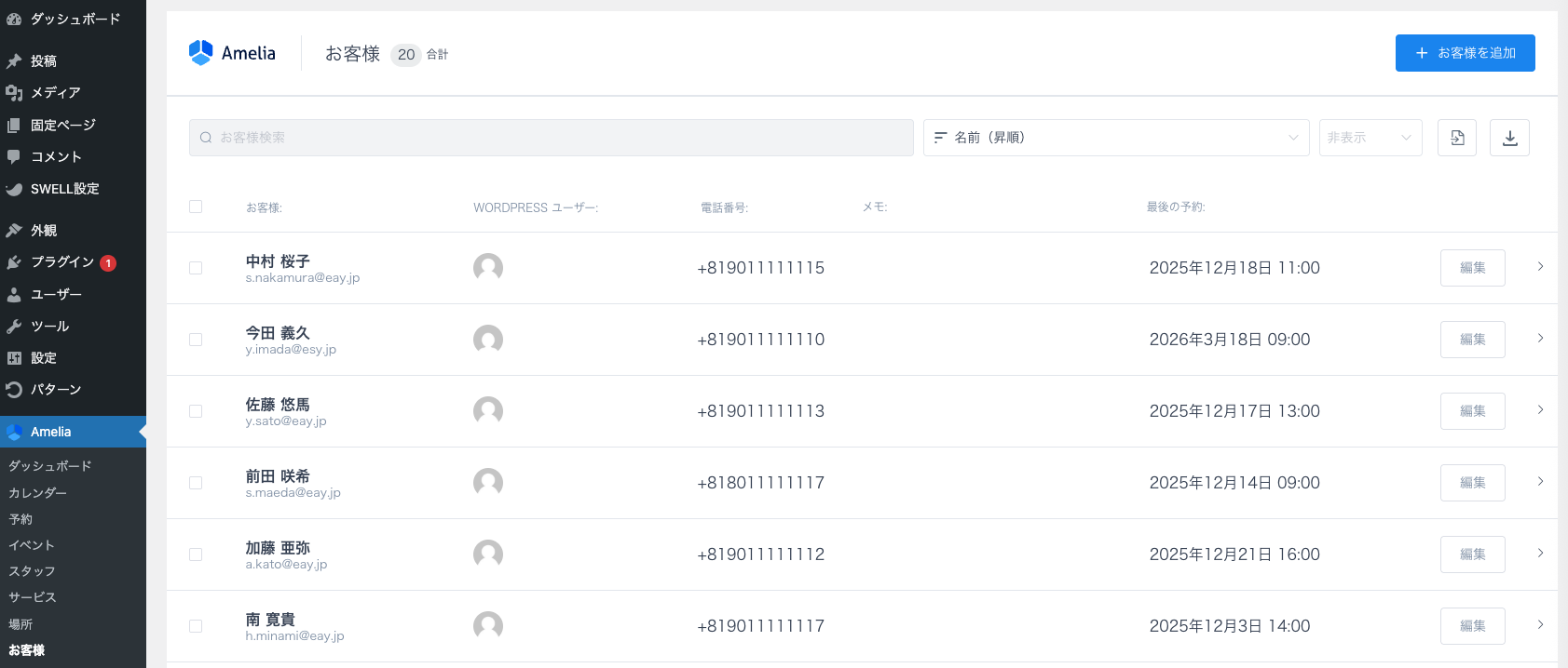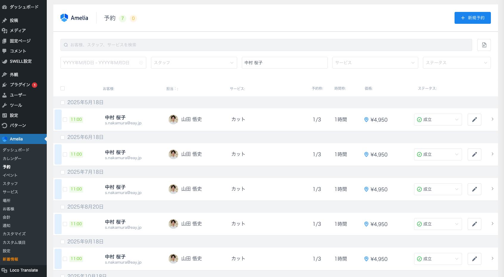予約を確認する」ボタンをクリックすると、「予約」ページが開き、選択したお客様が予約したすべての予定の一覧が表示されます。この機能により、お客様の予約履歴に簡単にアクセスでき、予約管理をより効率的に行うことができます。