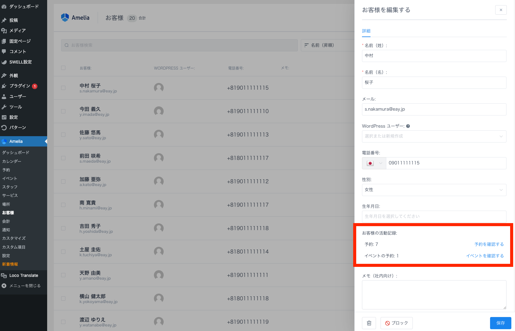 表示画面内で、そのお客様に関連するすべての予約(予定とイベントの両方)の総合的な情報を確認できます。