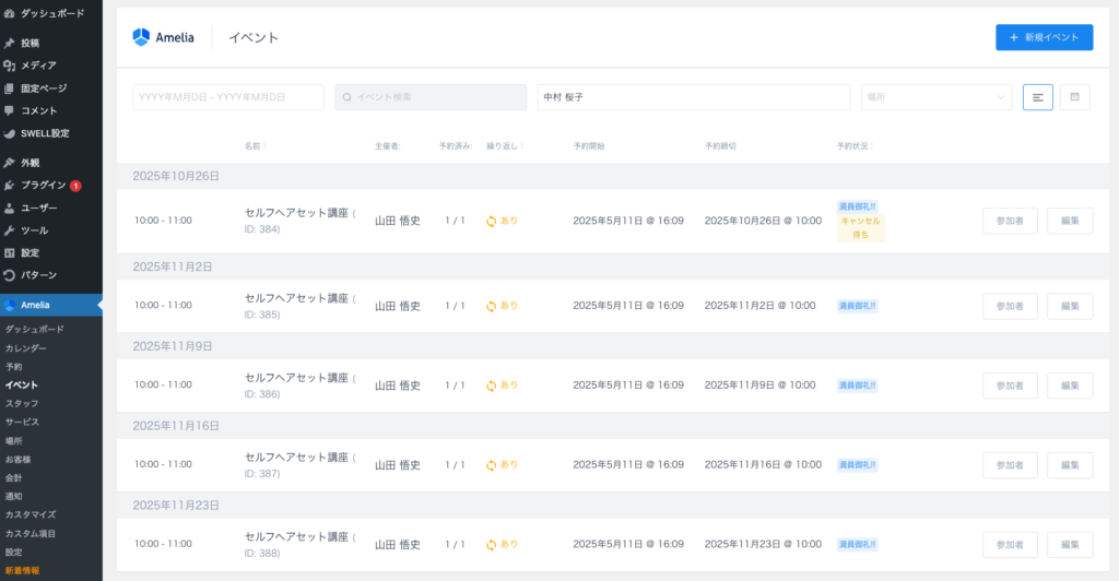 イベントを確認する」ボタンをクリックすると、「イベント」ページが開きます。ここでは、選択したお客様が予約したすべてのイベントのリストを確認できます。これにより、お客様のイベント参加状況の管理と分析が容易になり、お客様のニーズへの対応力が向上します。