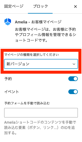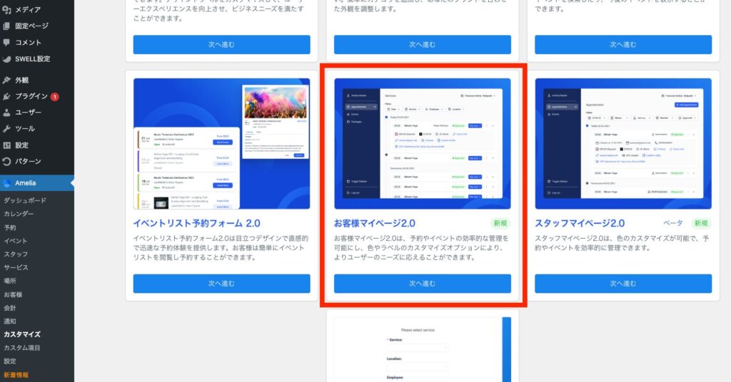 Ameliaのカスタマイズセクションにアクセスするときは、「お客様マイページ2.0」オプションを選択してください。