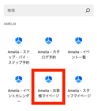 お客様マイページを使い始めるには、マイページを表示する専用ページを作成する必要があります。お客様マイページは、Ameliaブロックを簡単に追加できます。「Amelia – お客様マイページ」ブロックを選択してください。
