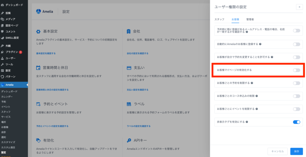 お客様マイページを有効にするには、「設定」ページに移動し、「ユーザー権限の設定」を開きます。表示画面内で「お客様」タブを選択し、「お客様マイページを有効にする」オプションを選択します。