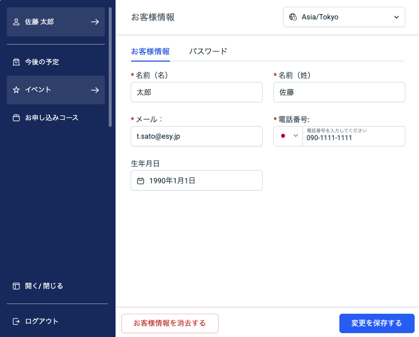 • 有効の場合: お客様のプロフィールに「削除」ボタンが表示され、データベースから個人情報のみを削除できます(予約は削除されません)。削除後も、管理者は予約状況によりお客様IDで予約を確認できます。