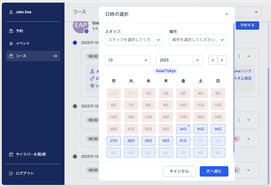 • 予約変更:お客様は、コース内の予約を「予約」タブから直接簡単に予約変更できます。また、コース内で追加の予約をする際には、カレンダー上部のドロップダウンリストから希望する担当者を選択することもできます。
