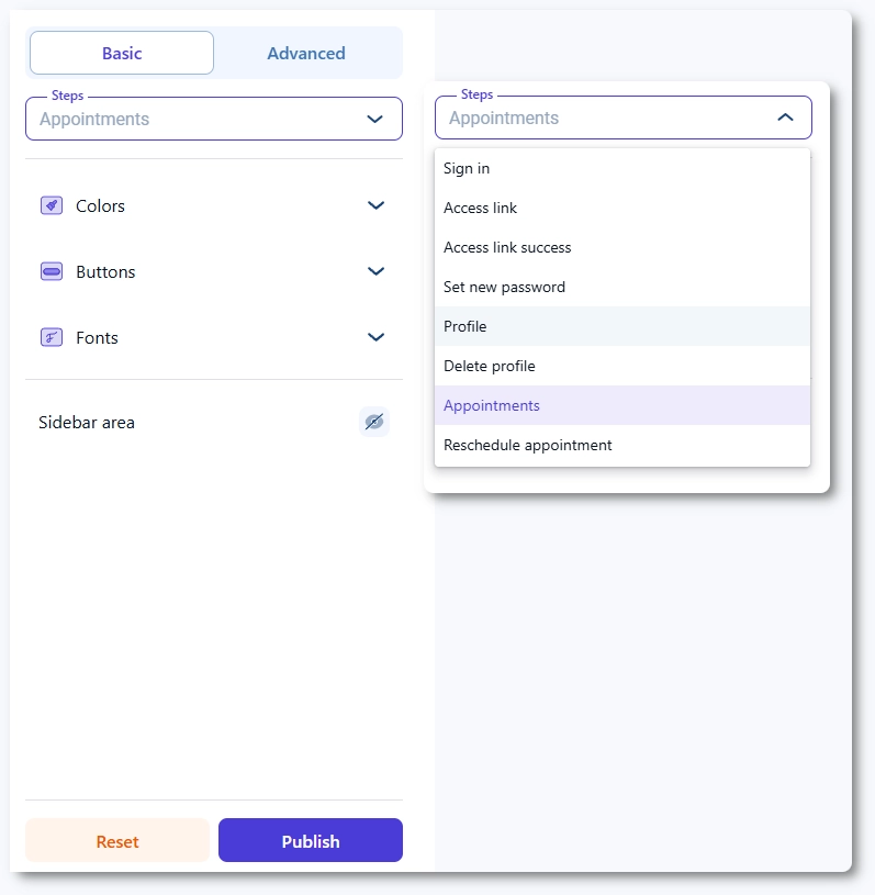 カスタマイズツールは他のフォームと同様に機能し、「基本」タブでのグローバルなスタイリングと、「詳細」タブでの各ステップごとの詳細なコントロールが可能です。ただし、お客様マイページはプロフィール管理、スケジュール管理、アカウントアクセスなどのフローを網羅しているため、より多くの表示画面やポップアップが含まれています。