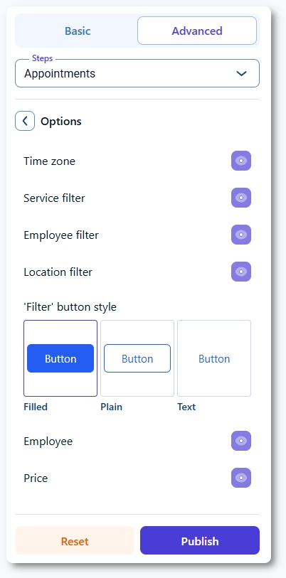 「オプション」では、ボタン、列、アイコンなどの要素の動作や表示の有無を制御します。「ラベル」では、ご自身のトーンに合わせてタイトル、セクション名、列ヘッダー、ボタンテキスト、システムメッセージなどの名前を変更できます。「カラー」では、サイドバー、カードの背景、リストの行、ポップアップ、および予約日時の変更に使用されるカレンダー要素などの特定の領域を調整できます。