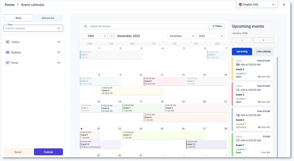 イベントカレンダーフォームは、イベントをインタラクティブなカレンダーレイアウトで表示し、お客様が日付をブラウズしたり、イベント詳細を開いたり、ガイドに沿ったフローで予約を完了したりできるようにします。