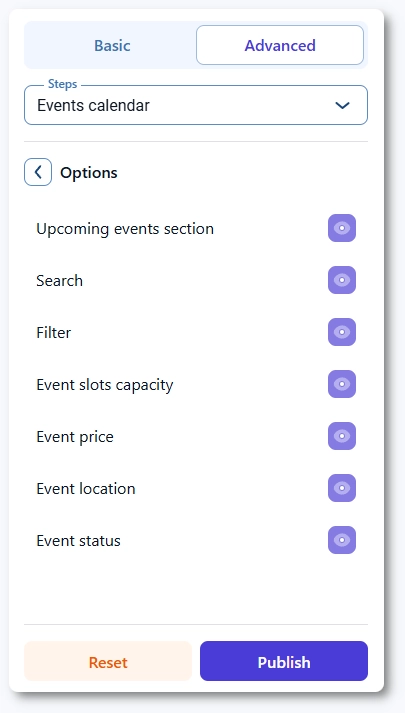 詳細設定タブでは、イベント予約プロセスの各ステップを微調整できます。これには、項目の動作や表示を制御するためのオプション、テキスト要素の名前を変更するためのラベル、および選択したステップの特定の領域をカスタマイズするための色が含まれます。