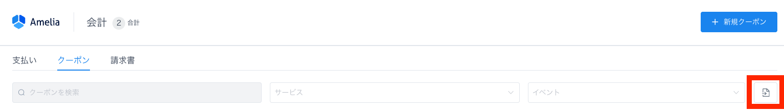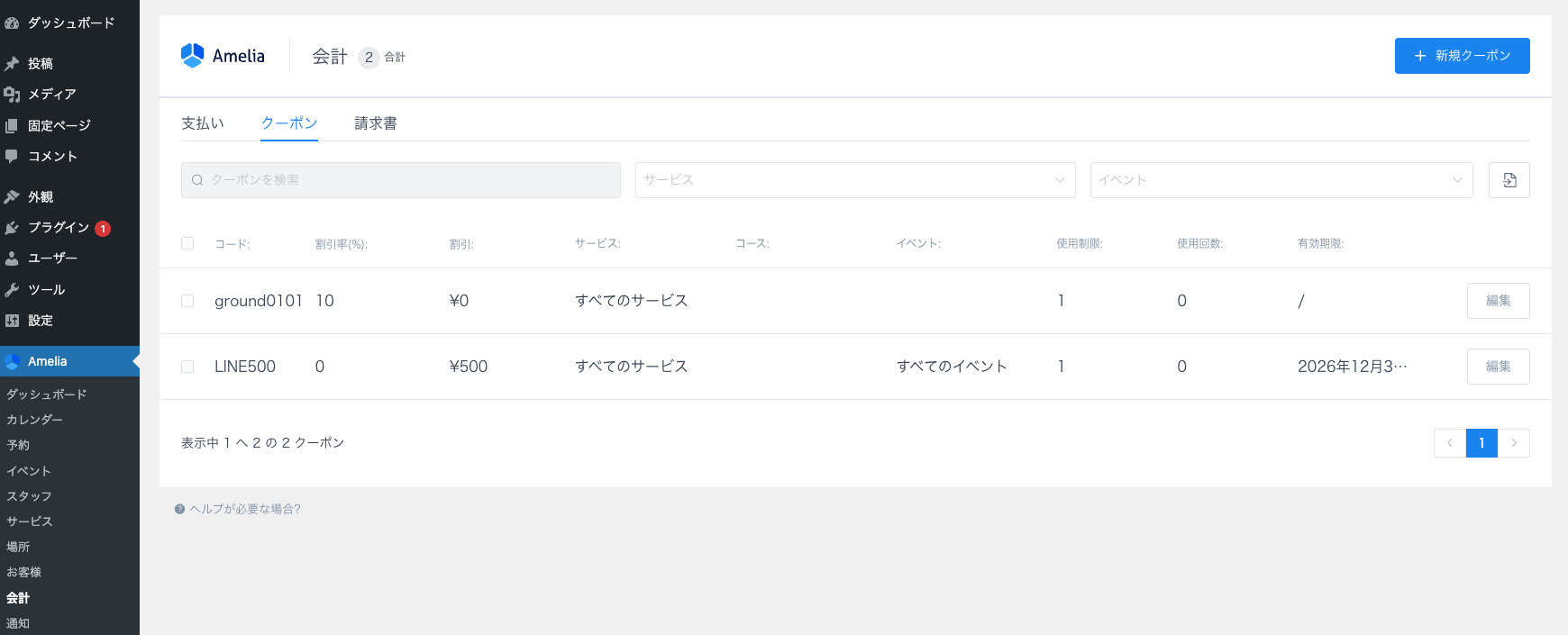 Ameliaの「支払い設定」で「クーポン」オプションを有効にすると、Ameliaの「会計」ページに「クーポン」タブが表示されます。このタブでは、予約、イベント、コースの価格を一定の割合(パーセント)または指定額で割引するクーポンを作成できます。