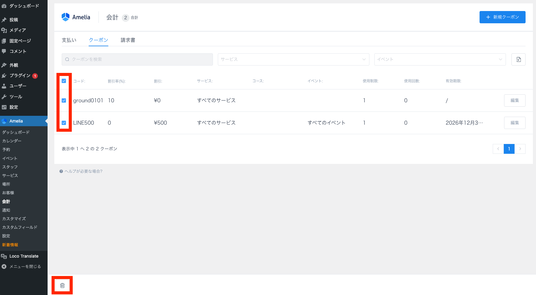 削除したいクーポンにチェックを入れることで、複数のクーポンをまとめて削除できます。削除したいクーポンを少なくとも1つチェックすると、ページ下部に編集ボックスが表示されます。クーポンの削除を確定したら、「ゴミ箱」アイコンをクリックし、「削除」ボタンをクリックしてください。