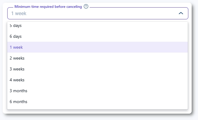 「キャンセルまでに必要な最小時間」オプションを使用すると、お客様が予約をキャンセルできるイベント開始前の時間を設定できます。この設定を有効にすると、指定したしきい値を過ぎた後、お客様はキャンセルできなくなります。この設定はデフォルトで無効になっており、有効にすると、分、時間、日、週、月などの幅広いプリセット間隔から選択できます。