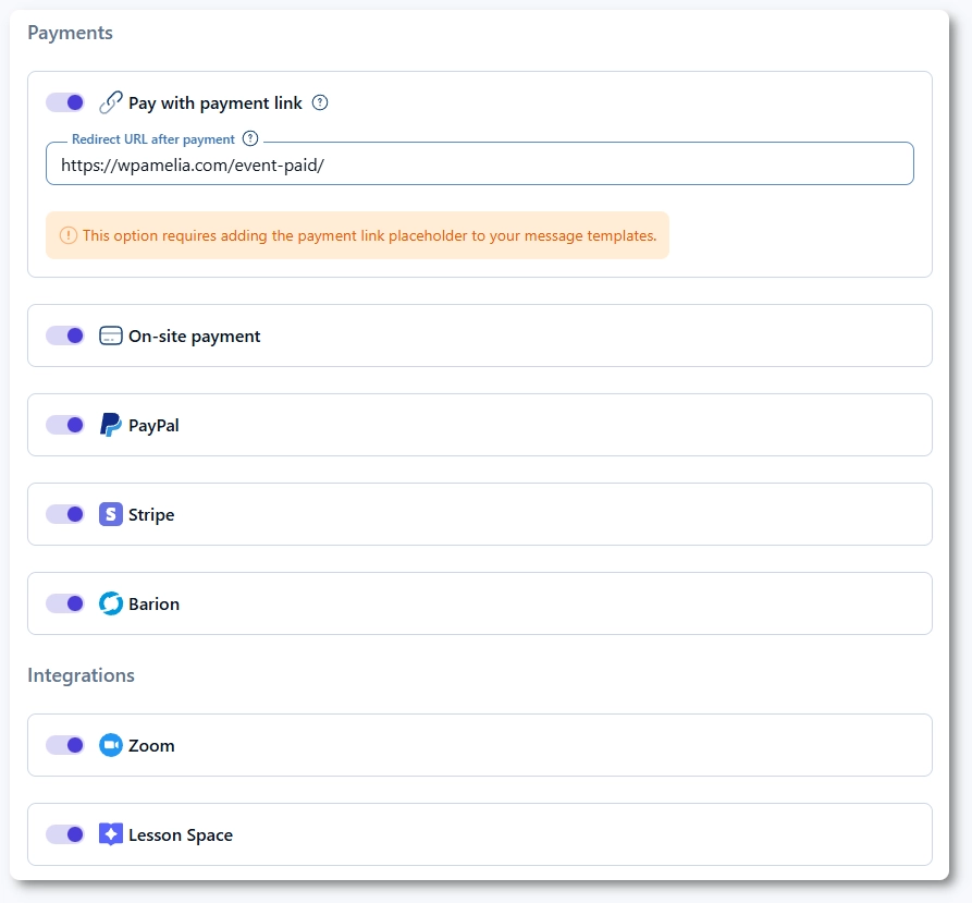 Ameliaのインストールに Zoom や Lessonspace が含まれている場合、それらの設定もここに表示されます。該当する場合、これらの連携を有効にすると、イベントのオンライン会議リンクが生成されます。