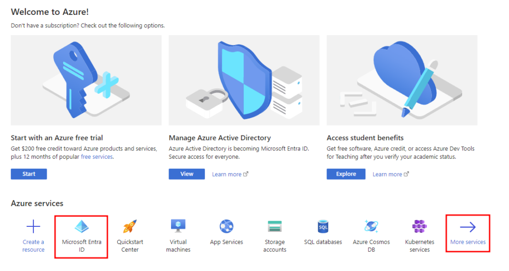「Client ID」と「Client Secret」を設定するには、Azureポータルにアクセスし、Azureサービスの中から「Microsoft Entra ID」を見つけて選択します(最初の行に見つからない場合は、右側の「More services」をクリックして探してください)。