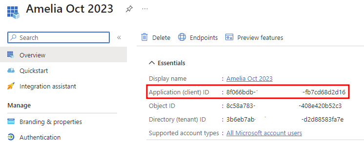 作成されたアプリケーションがすぐに開き、アプリケーション名の下に「Application (client) ID」が表示されます。このIDをコピーして、Outlook連携のフィールドに貼り付けてください。