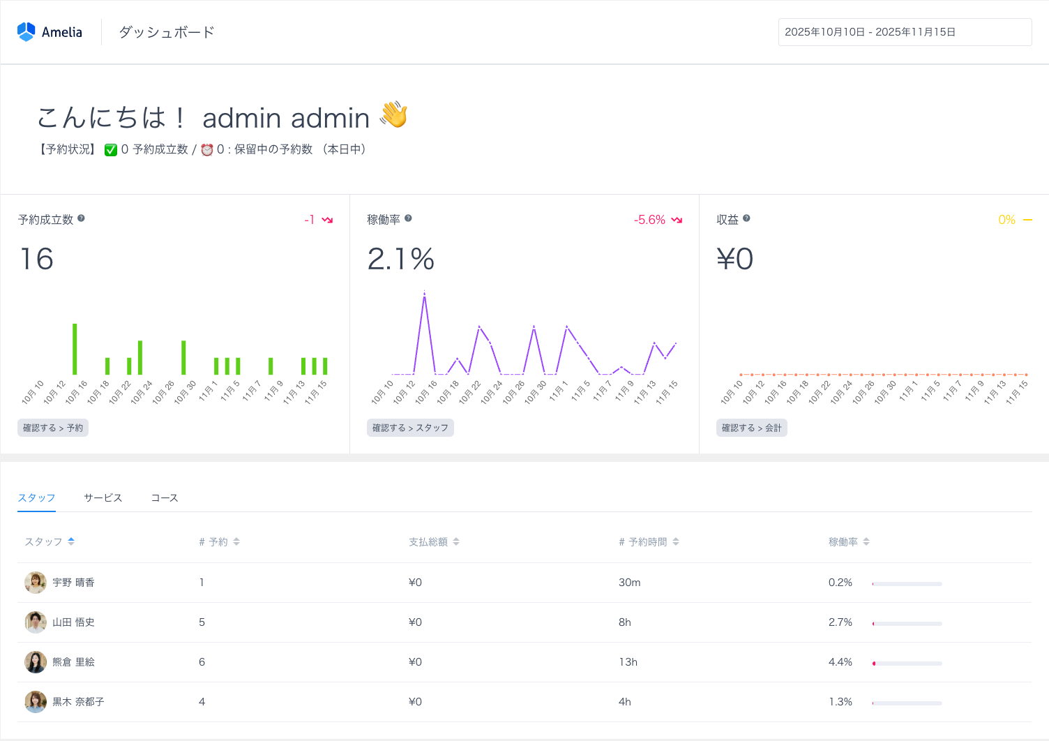 「ダッシュボード」ページは、「管理者」または「Amelia Manager」のユーザー権限でログインしている場合に、Ameliaを開いたときに最初に表示されるページです。この表示画面には、すべての予約、サービス、スタッフ、収益に関する一覧情報がまとめられています。ダッシュボードは3つのセクションに分かれており、それぞれの詳細情報が表示されます。