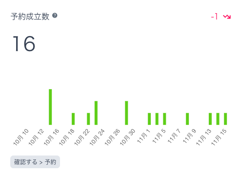 場所への関心度 / コンバージョン:このチャートは、選択した期間における、選択した場所での予約希望と、その場所での予約済み件数の比較を、場所名ごとに表示します。お客様が「予約を確定」画面を開くと、選択した場所への関心度が1増加します。