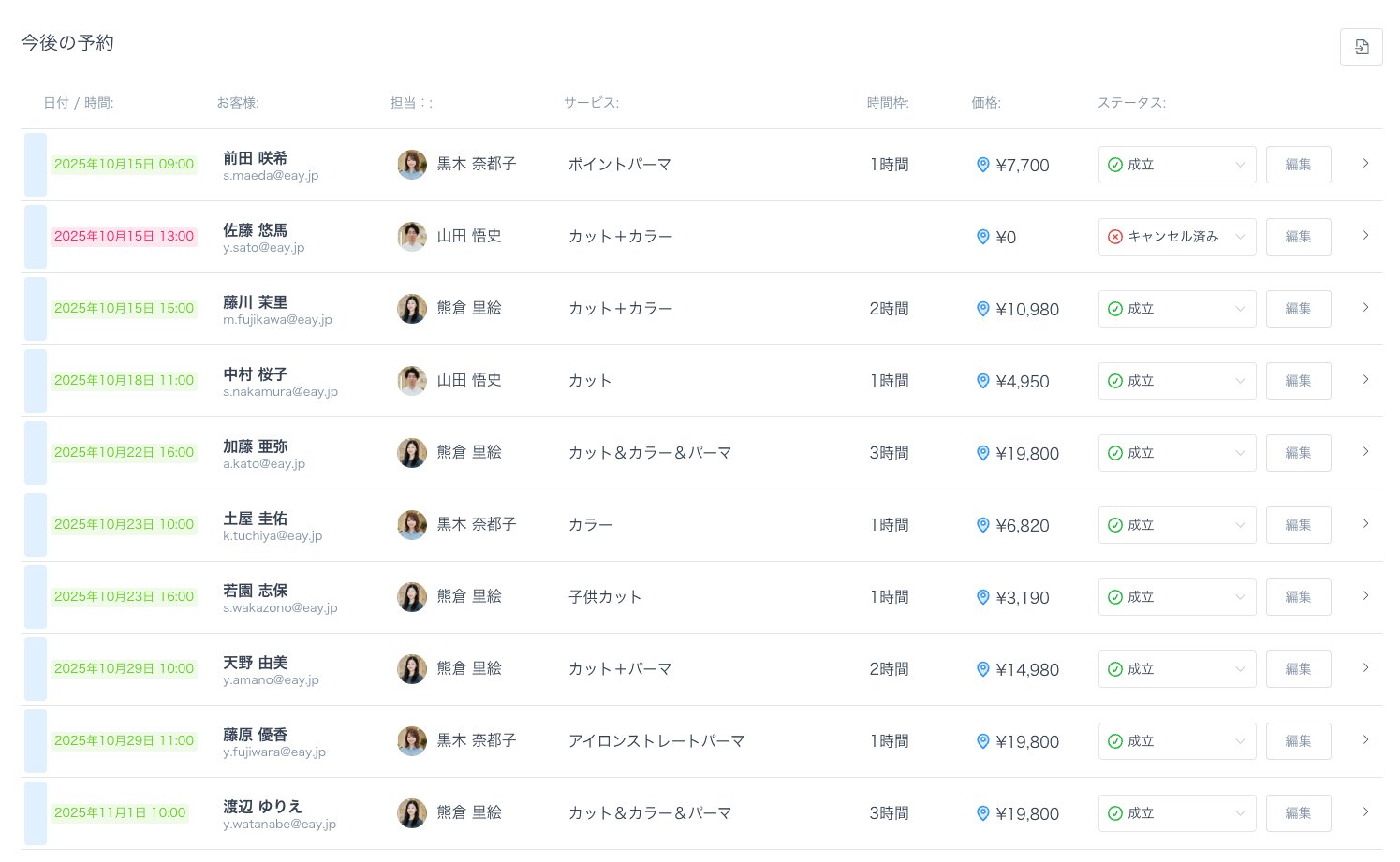 既存の予約を編集するには、変更したい予約の右側にある「編集」ボタンをクリックします。「編集」ボタンをクリックすると編集画面が開き、既存の予約データを更新できます。このボタンが無効になっている場合は、その予約は既に終了しており、変更できません。