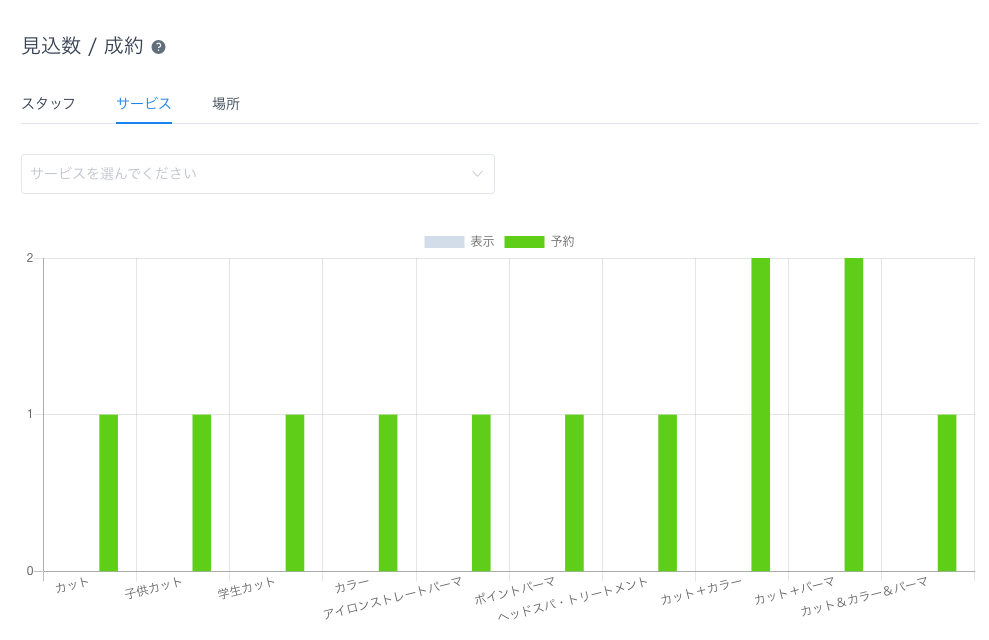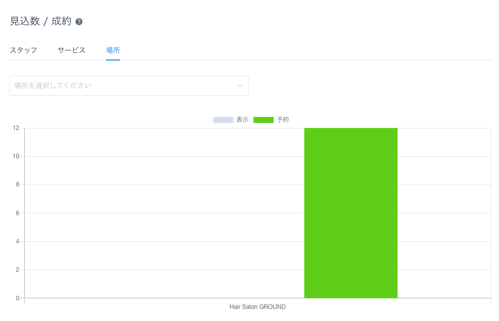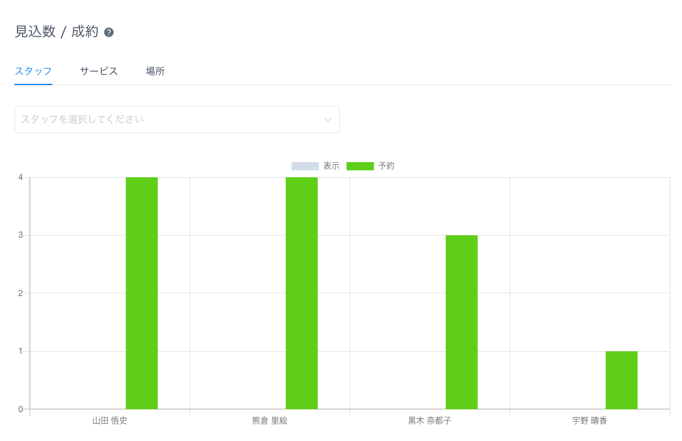 スタッフの関心度 / コンバージョン:このチャートは、選択した期間におけるスタッフへの予約希望と、そのスタッフでの予約件数の比較を、スタッフ名別に表示します。お客様が「予約確認」画面を開くと、選択したスタッフへの関心度が1増加します。