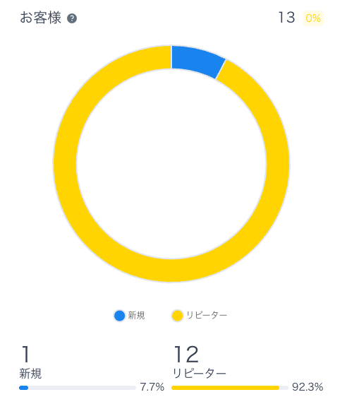 セクションの右側にはお客様データが円グラフで表示されるため、新規とリピーターのお客様数を簡単に確認できます。グラフの右上隅に表示されるパーセンテージは、選択した期間におけるお客様数の増減を示しています。
