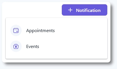 新しい通知を作成するには、Amelia → 通知を開き、「+ 通知」をクリックします。予約またはイベントのどちらの通知を作成するかを選択できます。ページはデフォルトでお客様マイページタブで開くため、スタッフ用のカスタム項目通知が必要な場合は、作成前にスタッフマイページタブに切り替えてください。