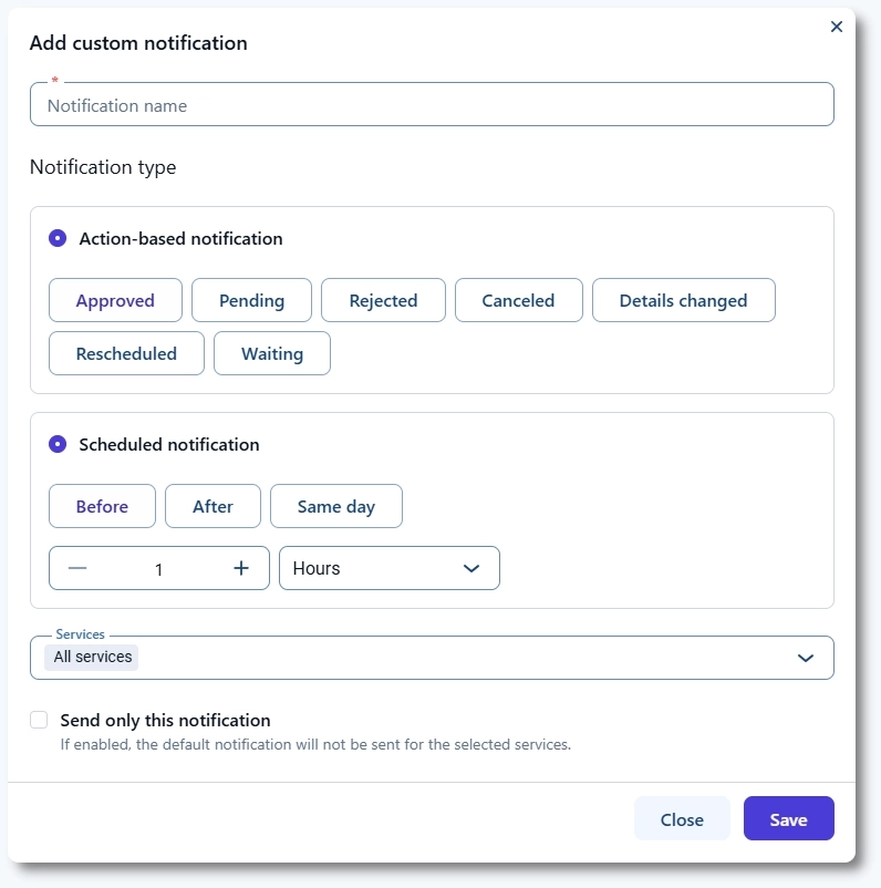 承認および保留の通知は、そのステータスで予約が作成されたとき、またはステータスが変更されたときに送信されます。却下およびキャンセルの通知は、スタッフが却下した場合や、お客様が予約をキャンセルした場合をカバーします。詳細変更は、日付、時間、場所などの重要な情報が更新されたときに使用され、予約日時の変更は予約が別の時間枠に移動されたときに使用されます。キャンセル待ちは、デフォルトの予約キャンセル待ちリスト通知と同様に、お客様が予約のキャンセル待ちリストに追加されたときに送信されます。