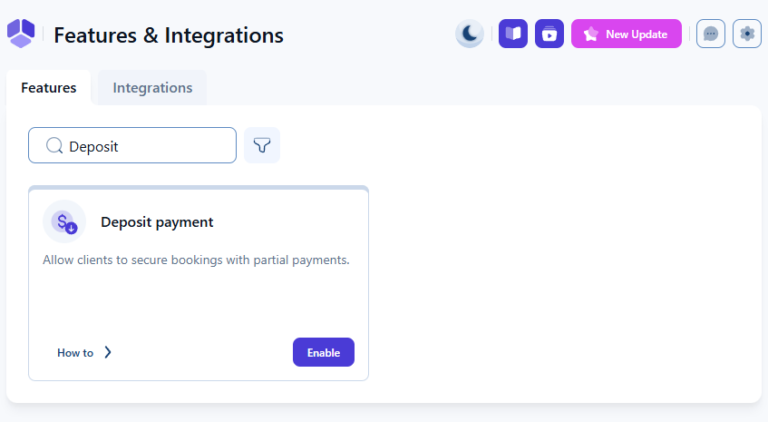 「機能と連携」の「機能」セクションで前払金決済を有効にできます。この機能を有効にすると、個別のサービス、イベント、およびコースで前払金オプションが利用可能になり、特定のタイプや金額を設定できるようになります。