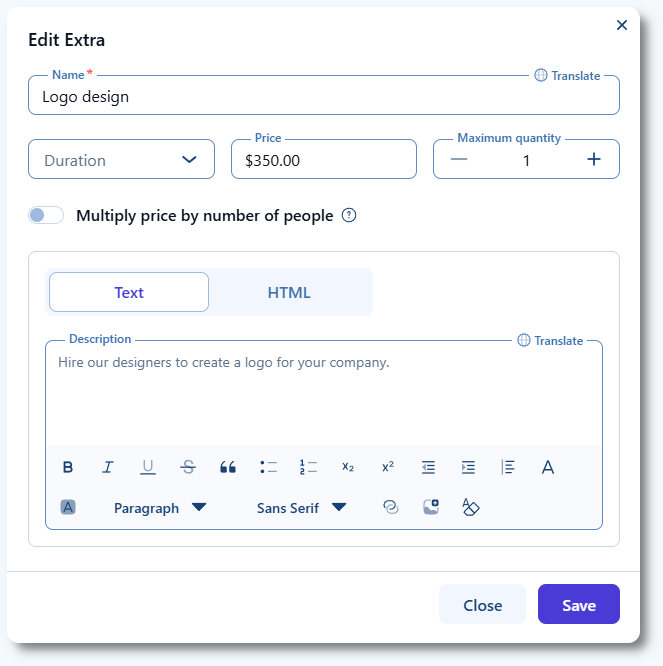 「追加オプション」タブの「+ 追加オプション」をクリックして作成画面を開くか、3点ドリーダーメニューを使用して既存の追加オプションを編集します。必須項目は名前のみです。時間は、予約時間を延長する追加オプションに役立つオプション設定です。料金を設定すると、「料金をお客様の人数で乗算する」スライダーが有効になります。説明文は、その追加オプションが何を提供するのかをお客様が理解するのに役立ちます。最大数量は、1回の予約ごとに追加できるユニット数を制限します。