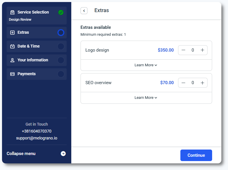 追加オプションは、サービスを選択した直後、かつ日別と時間枠を選択する前に表示されます。お客様は料金や説明を確認し、数量を調整できます。