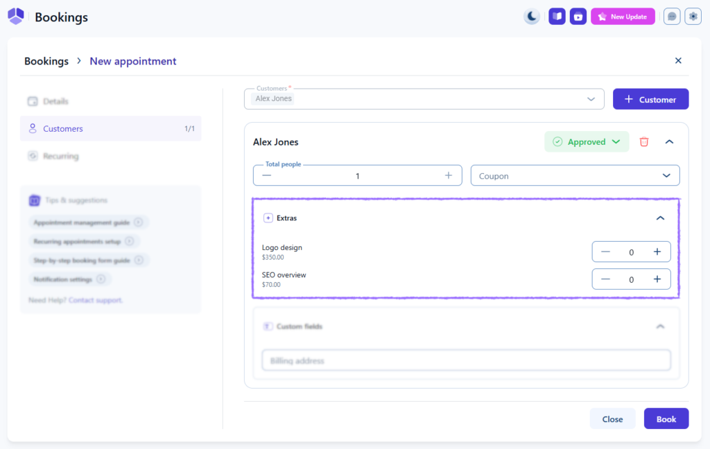 「予約」→「予約リスト」で予約を作成する際、追加オプションの設定があるサービスを選択し、次にお客様を追加します。予約詳細に利用可能な追加オプションが表示され、予約を保存する前に数量を調整できます。