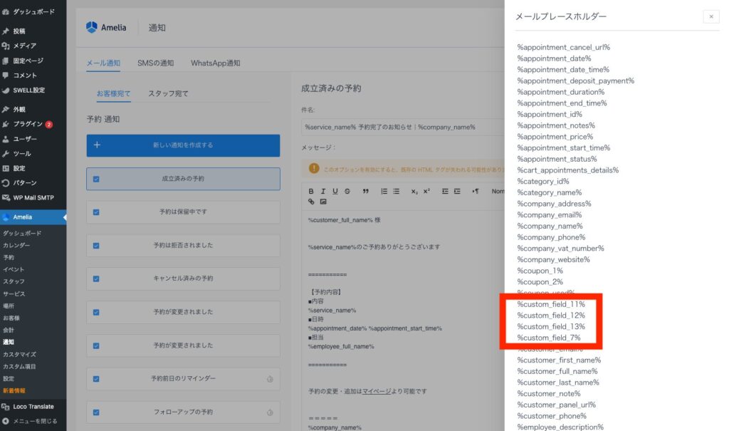 Ameliaで作成するすべてのカスタム項目は、メールおよびSMS通知に追加できます。