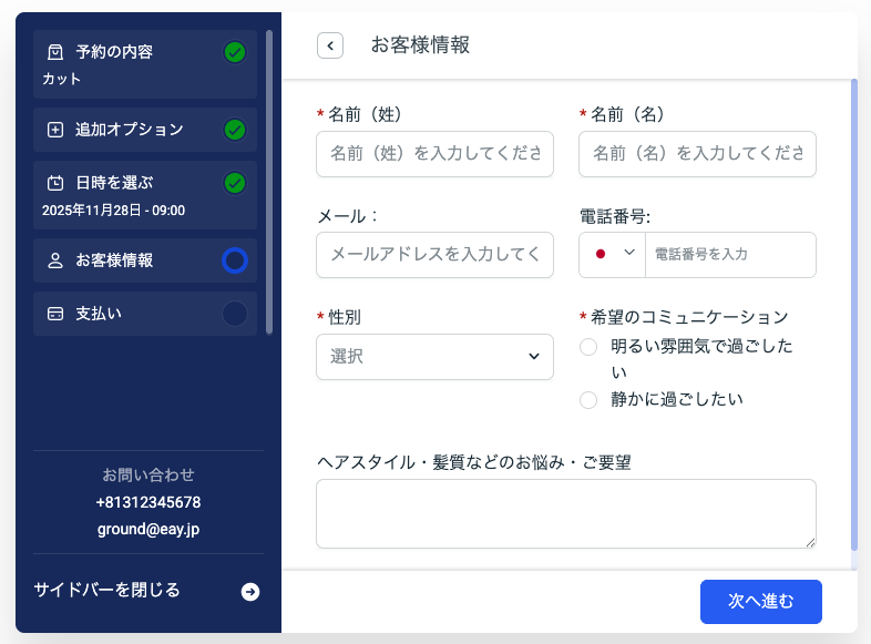 予約関連およびお客様関連のカスタム項目は、有効にすると、予約フォームのデフォルト項目の下に表示されます。