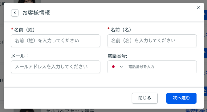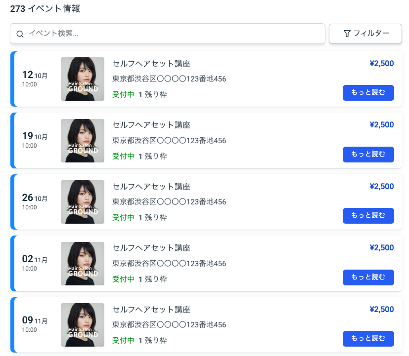 現在の設定によって、予約フォームの外観は異なる場合があります。以下の例では、設定が異なる複数のイベントが表示されています。