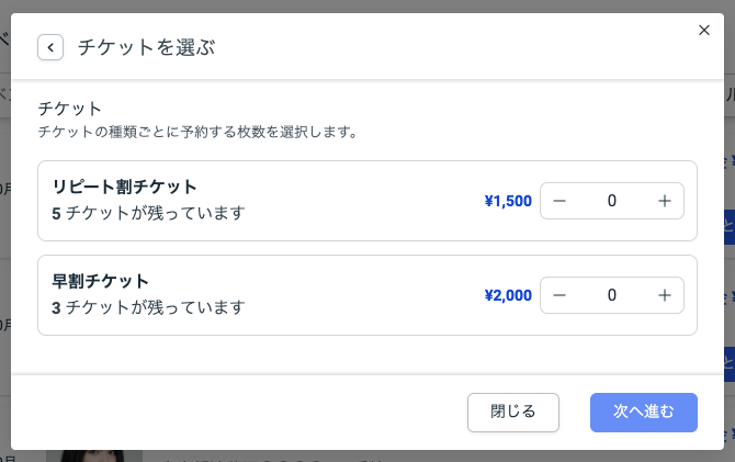 「詳細はこちら」をクリックすると、イベント情報とチケット情報を含むポップアップが開きます。「チケット」タブには利用可能なすべてのチケットと価格が表示され、「イベント情報」には以下の詳細が表示されます。