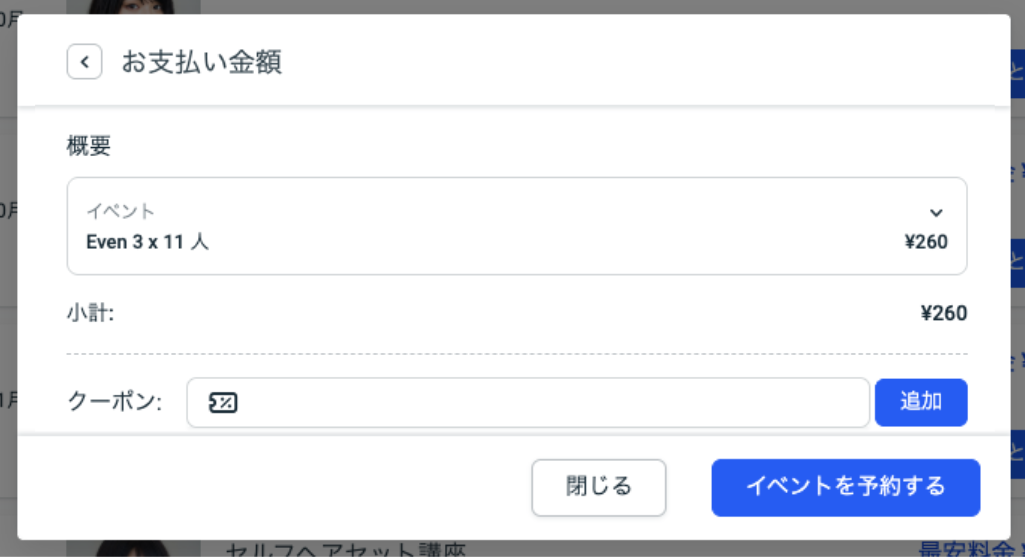 「次へ進む」をクリックすると、右下にある「イベントを予約」ボタンをクリックして実際にイベントを予約することもできます。